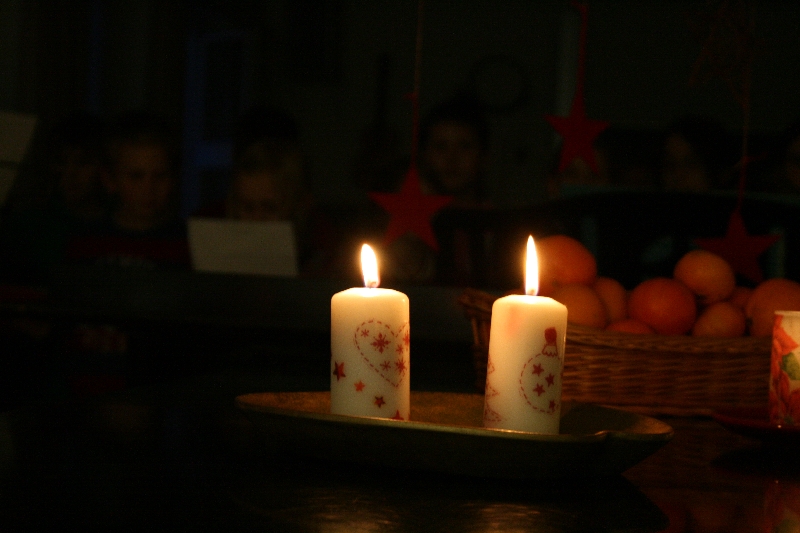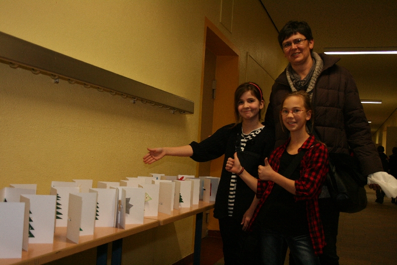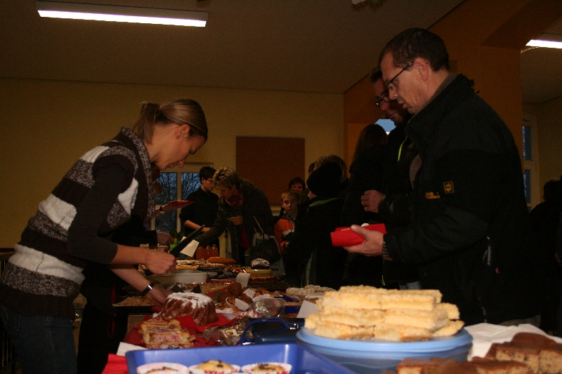 Wenn noch die passende Weihnachtsdekoration oder das eine oder andere Geschenk fehlte, standen für sie viele kreative Angebote zur Verfügung. Die Schülerinnen und Schüler konnten selbst Gelkerzen gießen, Teelichtlaternen falten, Schneemänner basteln oder recycelbare Weihnachtsdekoration herstellen. In gemütlicher Runde konnten die Eltern im Adventscafé in der Zwischenzeit viele Leckereien verzehren und die adventliche Stimmung genießen, die durch den Besuch des Nikolauses abgerundet wurde. Den Abschluss bildete ein Stück der Schwarzlichttheater-AG, das bei allen Gästen eine vorweihnachtliche Stimmung hinterließ. Durch all diese Aktionen waren am Abend die Spendendosen reichlich gefüllt und warten nun darauf, in den nächsten Tagen übergeben zu werden.